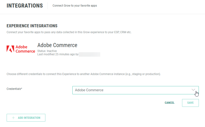 Note: The credentials reflect the Adobe Commerce API keys that are configured in the general Grow Account Integrations section. See this section above to set up an Adobe Commerce API key.