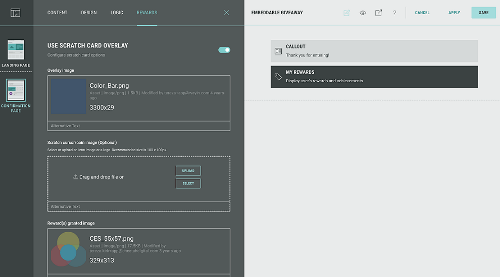 - Reward(s) Granted / No Reward Granted: This allows you to define a message when one or more rewards are granted (e.g. Great! You've won something), or when no reward is granted (e.g., Oops! Better luck next time).
