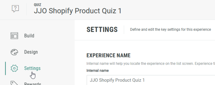 Once you have completed all the steps in the wizard, you land in your Experience area. Here you find several tabs to work through in order to build your Experience, configure the Shopify integration, define the Experience design, and publish your Experience.