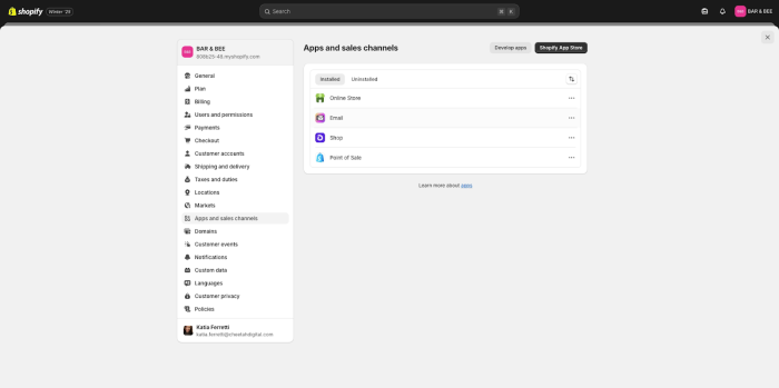 In the Settings area of your Shopify account, go to Apps and sales channels > Shopify App Store and search for and install the Headless App by Shopify.