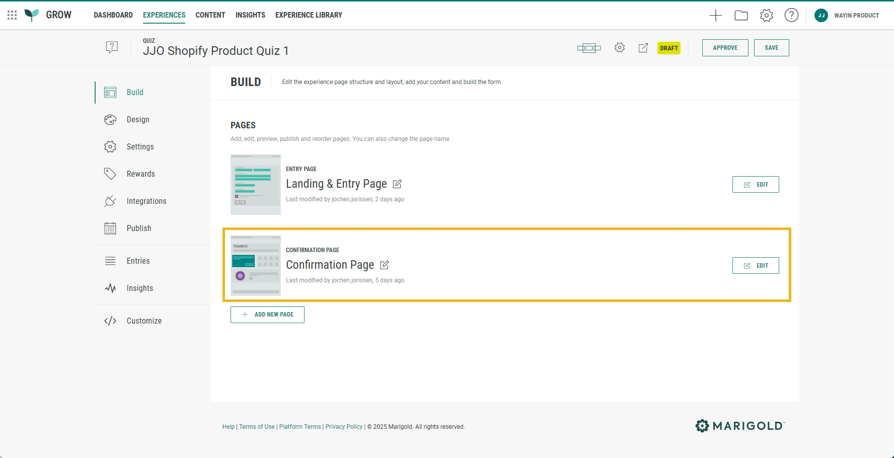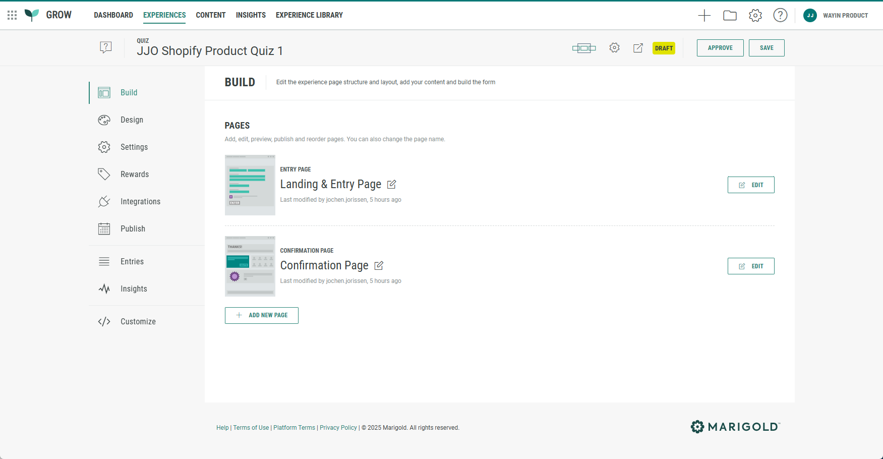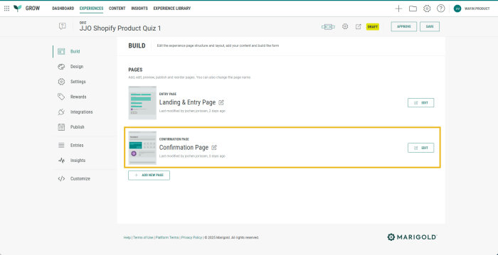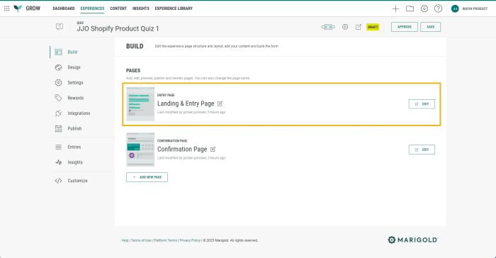 The Build tab offers an overview of the pages included in your Experience. Our Shopify Product Quiz comes with a Landing & Entry Page and a Confirmation Page.