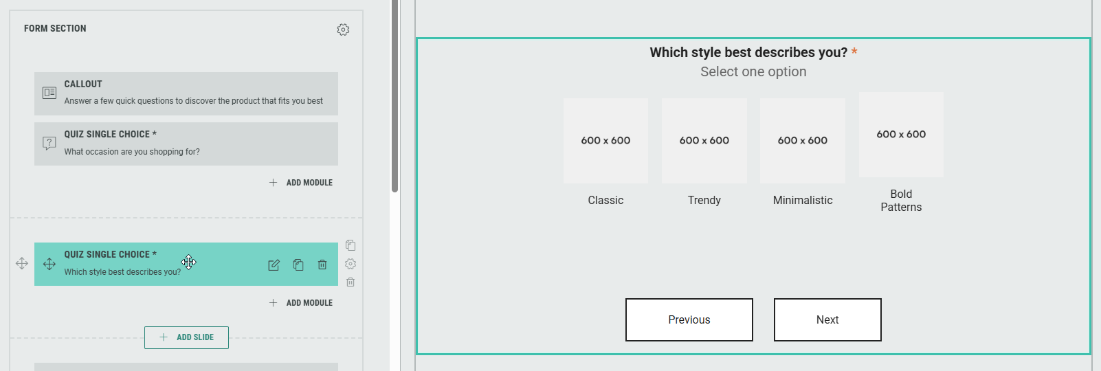 A Shopify Product Quiz is an outcome quiz that gathers data from entrants through Quiz Single Choice and Quiz Multiple Choice modules (and others), and has an integration with a Shopify account.