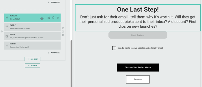 Slide 4 contains Content and Form-type modules — A Headline to show a title and description, an input field to request the participant's Email address, a checkbox to Opt-in to email offers and updates, and a Submit button.