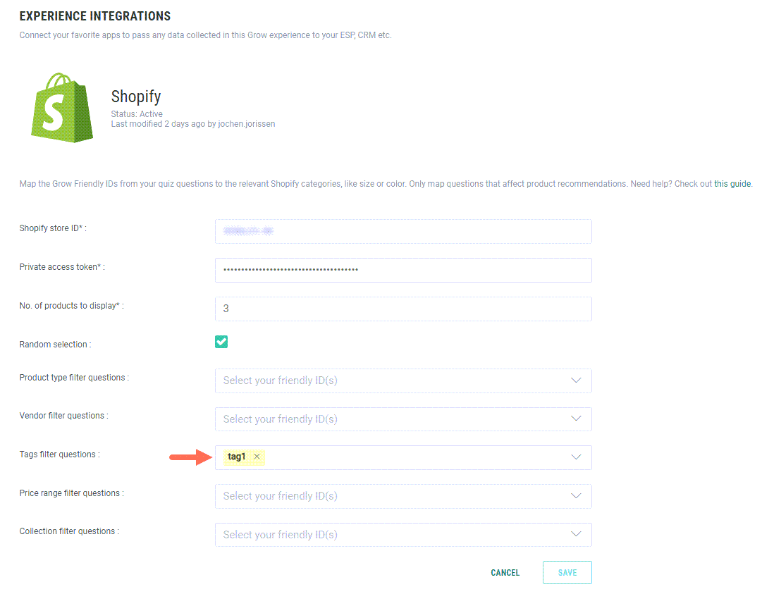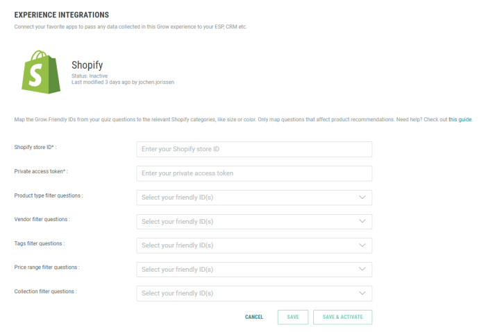 Enter the Shopify credentials for the integration between your Grow Experience and the Shopify store: