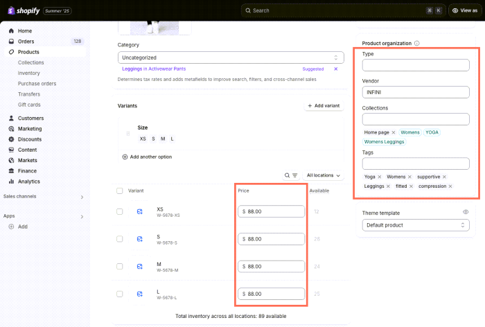 Note: The Shopify API doesn't support filtering by product category or category meta fields—use product type and tags instead. Product type (formerly custom product type) lets you define custom categories like Colorful linens beyond Shopify’s standard set.