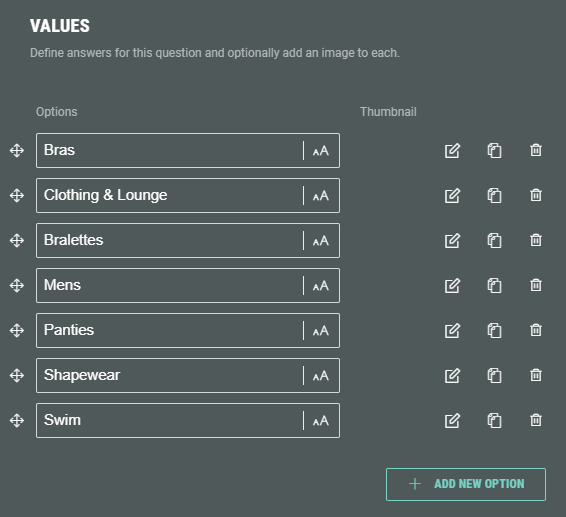 We add the following option labels as answers for that question: Casual, Formal, Workout, Party.