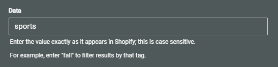 Note that the data value is case-sensitive and needs to have an exact match with the product data in Shopify.