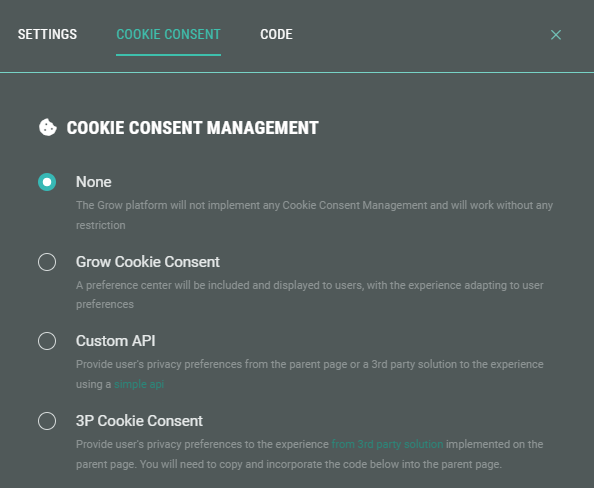1. If you don’t require cookie consent compliance, you can set the cookie consent to None. An example might be if you are promoting an Experience to a country that doesn’t have data protection and privacy legislation in place.