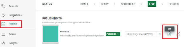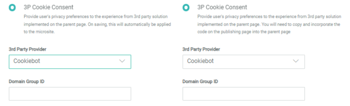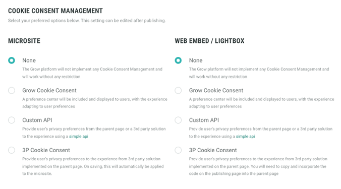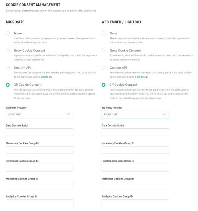 Important: Please ensure to update the following settings below for either Microsite or the Web Embed/Lightbox options, whichever applies to your Experience. For the Microsite, when you save the third party cookie consent settings, they will automatically be applied to the microsite; for the web embed/lightbox option, you will need to copy and incorporate the code on the publishing page onto the parent page to ensure the settings are applied.