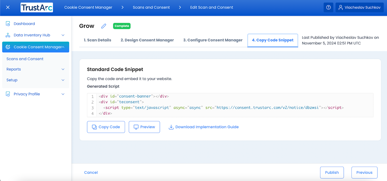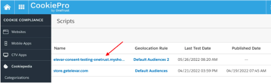 1. Navigate to Cookie Consent Manager > Scans and Consent and select the relevant domain you want to find the TrustArc Script URL for.