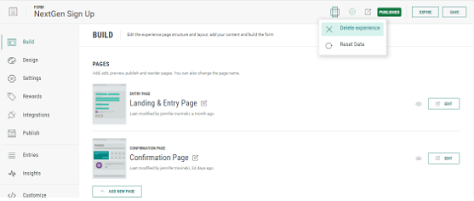 2. Once inside the Experience, click the Settings icon on the upper-right. In the drop-down, you will see a Delete Experience option or a Reset Data option.