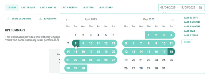 - Custom is applicable when you manually select start and end dates from the date picker.