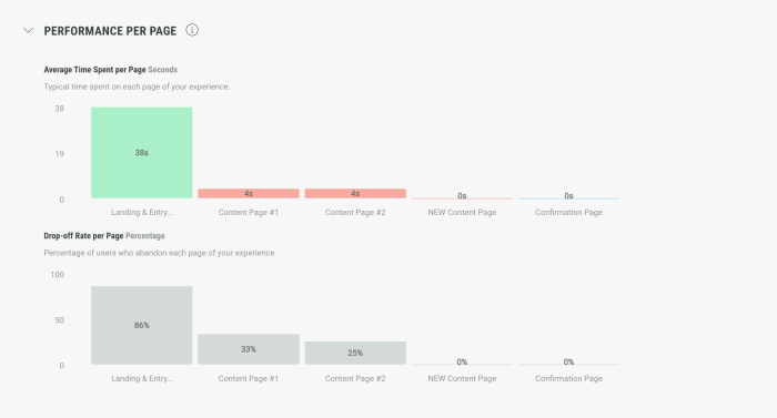 • Drop-off rate per page — The percentage of users who abandon each page of your Experience.