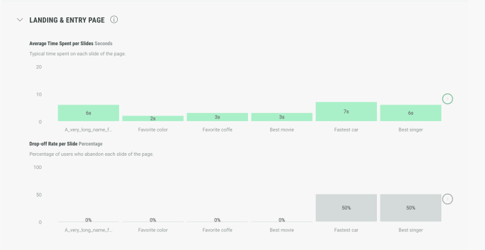 • Drop-off rate per slide — The percentage of users who abandon each slide of the page.