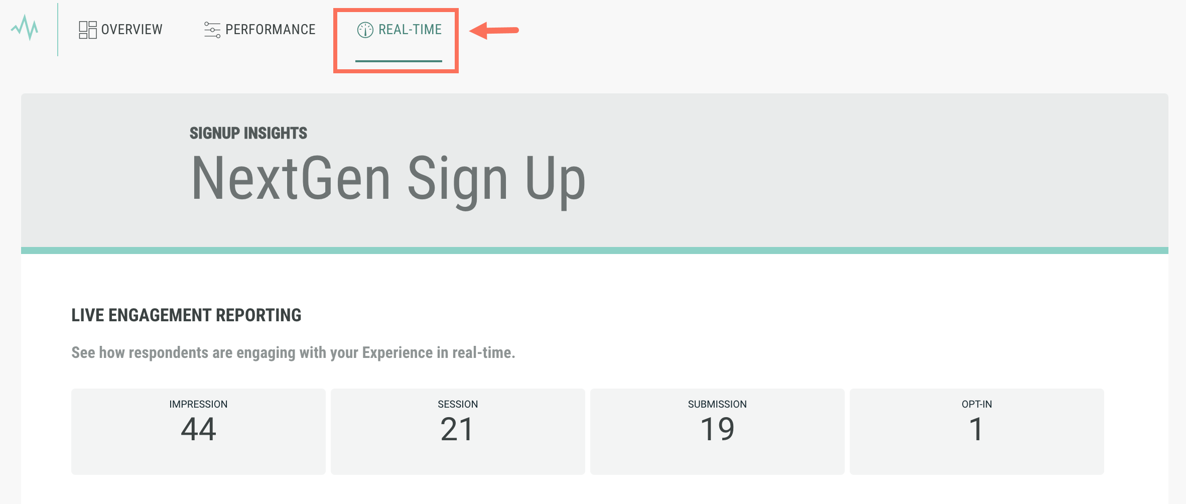 The video below showcases the real-time insights after viewing the Experience and submitting the Experience form. The exact moments when the impression and submission events took place are visible with the spikes in the chart.
