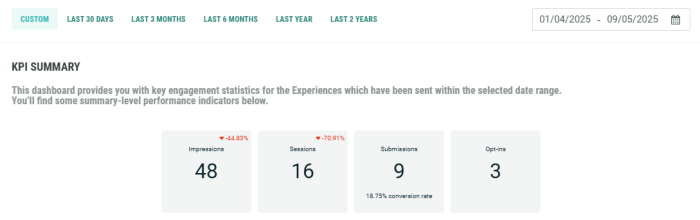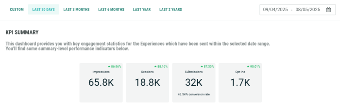The KPI summary provides key engagement statistics for the Experiences which have been sent within the selected date range.
