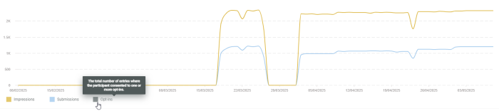 The Lines chart shows the following KPIs: impressions, submissions and opt-ins.