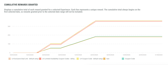 The lines show the total count of each reward granted prior to the date range and how that total changed over the selected period.