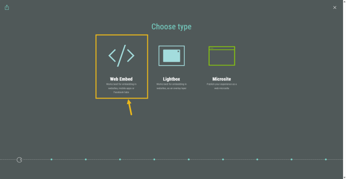 Publishing your Experience as a Web Embed generates code to embed the Experience as an iframe on a web page.