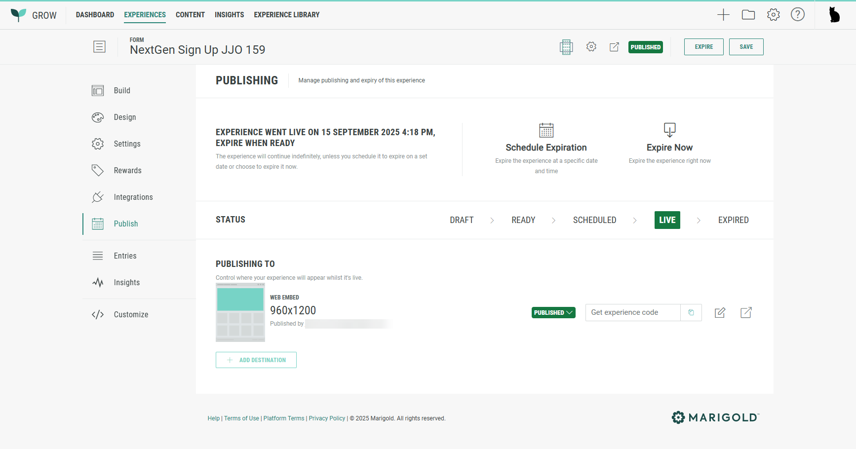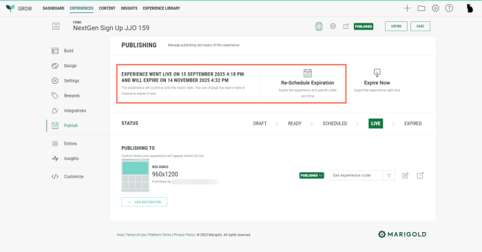 - A Schedule Expiration button is available to take the Experience offline at a specific date and time.