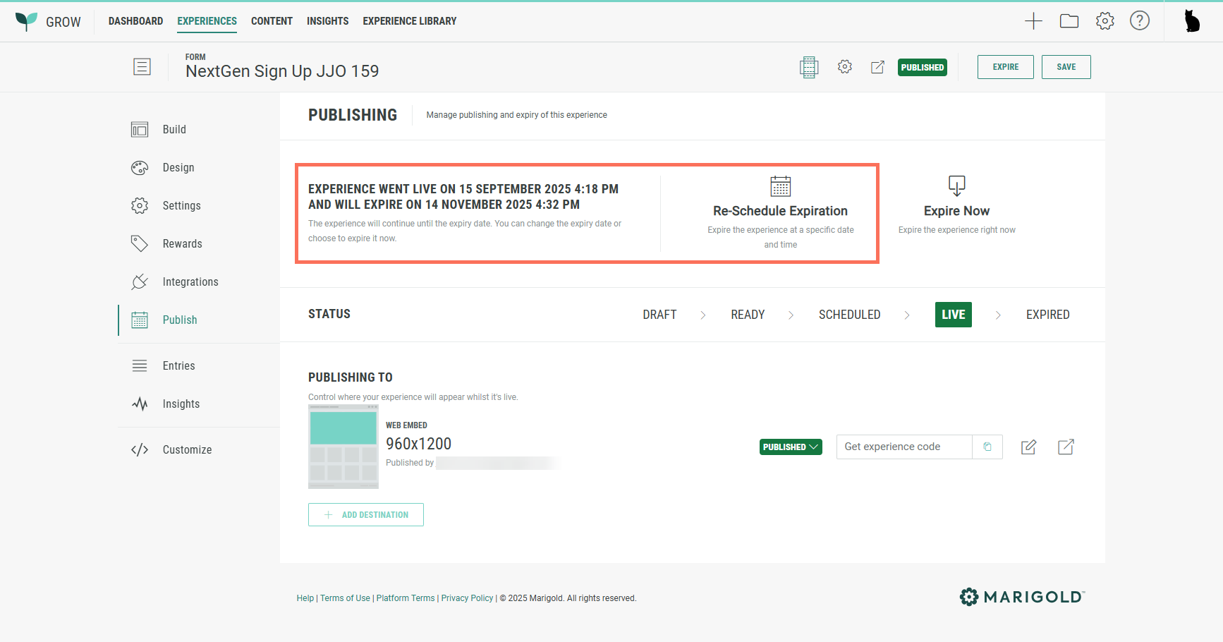 - When an expiration date has been set, the published Experience shows the text: Experience went live on [launch date/time], and will expire on [expiration date/time], and a Re-Schedule Expiration button is available.