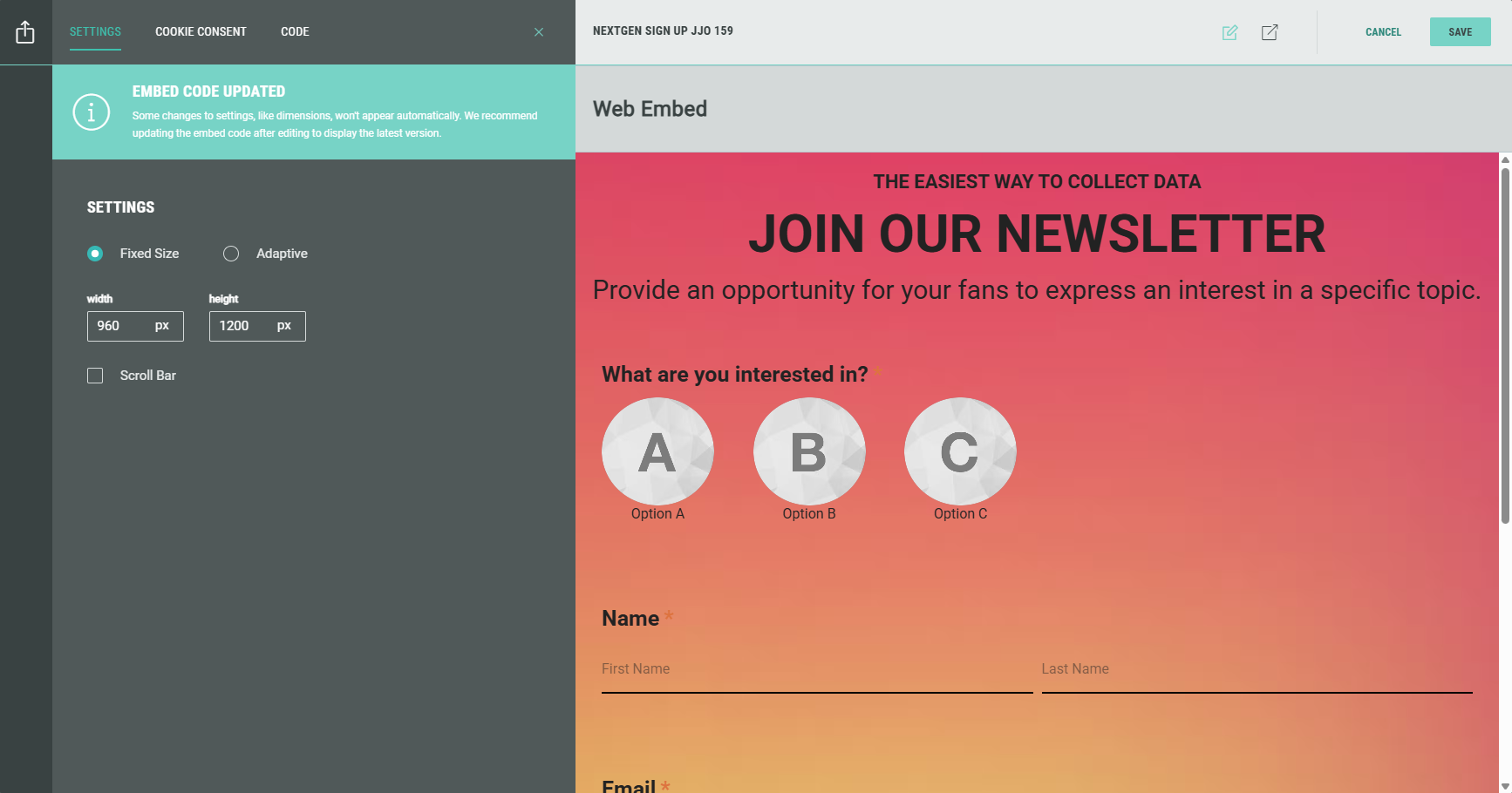 Note: Some changes, like dimensions, won't appear automatically. We recommend updating the embed code on your web page after editing, to display the latest version. Otherwise, the latest changes might not be reflected.