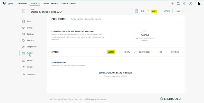 - Then click Approve to indicate the Experience meets all requirements and is ready for publication.