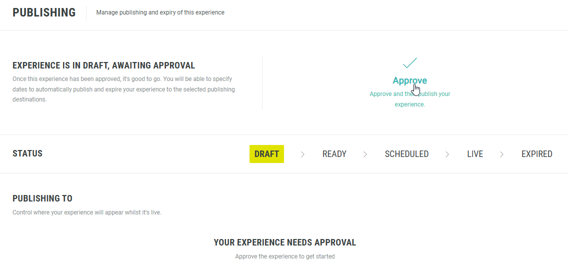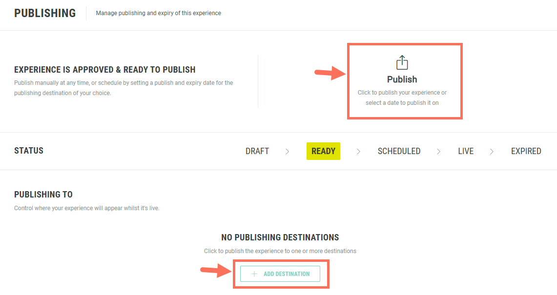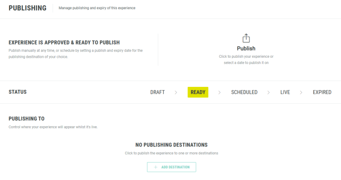 - Ready — Once an Experience is approved, it moves to the Ready phase to be scheduled or published.