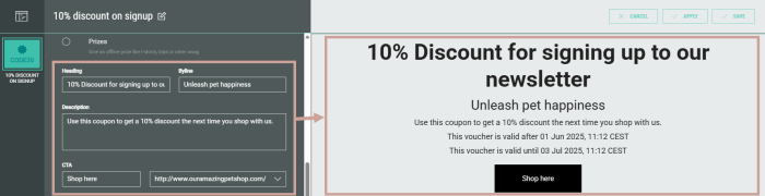 As an example we’re going to add a 10% discount coupon reward for everyone signing up to our newsletter. The other possible configuration options will be covered so you can add any reward to any Experience.