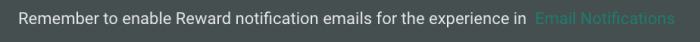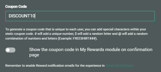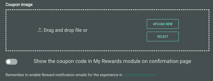 - You can enable reward notification emails for your Experience by clicking on the link shown. This option is available whether or not you have chosen to display coupon codes (if you’re using them) in the rewards module on the confirmation page of the Experience.