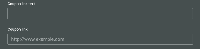 Link to coupon: You will simply need to add the link to the URL where your customers can get their coupon code and the text to display.
