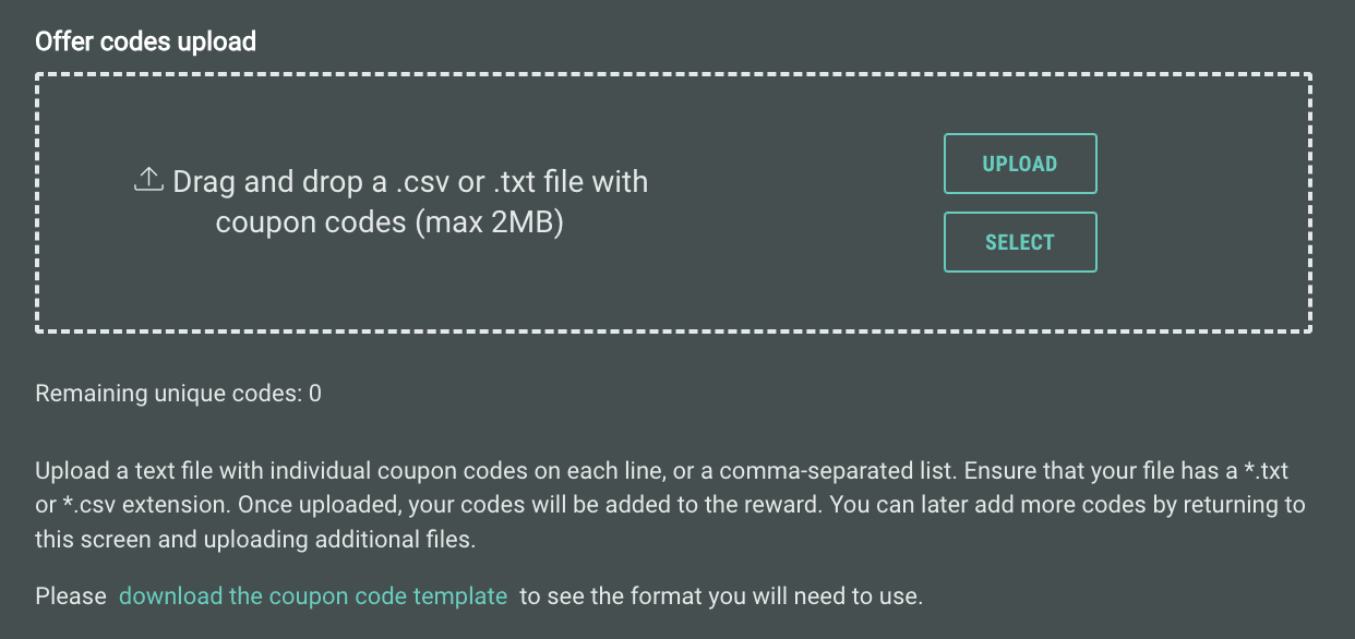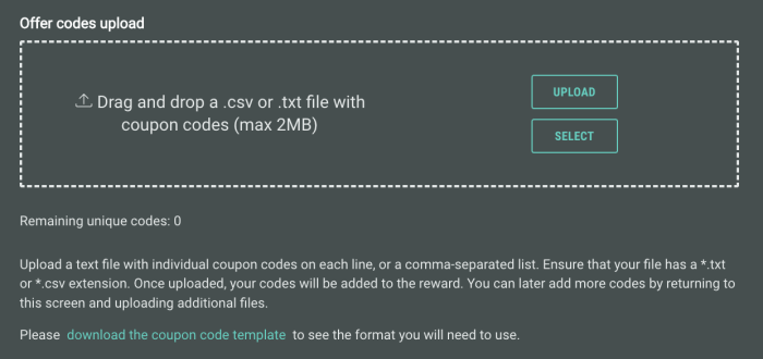 Uploaded codes: You will be prompted to upload or drag and drop your CSV file using the code format specified in the file that's accessible through the download the coupon code template link.