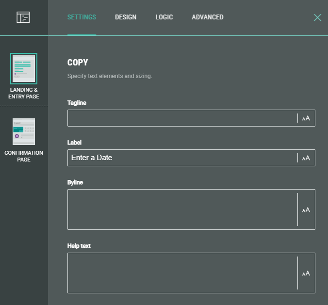 The following sections are available which can be edited (from the tabs at the top): Settings, Design, Logic, Advanced.