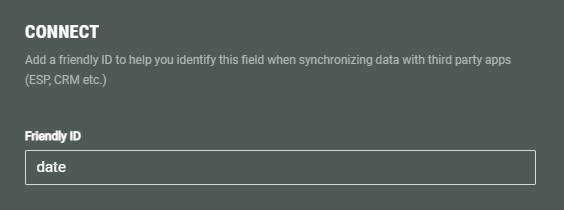 - Connect — You can add a Friendly ID to help you identify this field when synchronizing data with third party apps (ESP, CRM etc.)