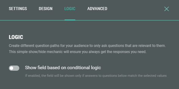 The following sections are available which can be edited (from the tabs at the top): Settings, Design, Logic, Advanced.