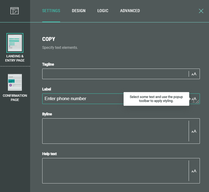 1. Copy — Specify text content and apply styling for tagline, label, byline and help text.