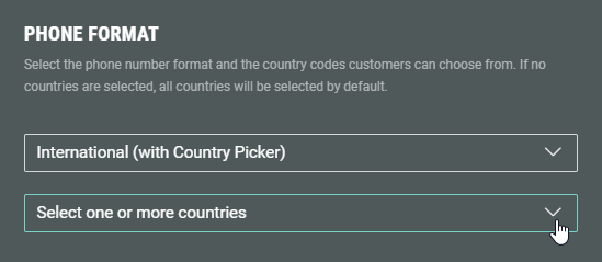 Selecting International (with country picker) as phone number format shows a second drop-down, in which you can select one or more countries.