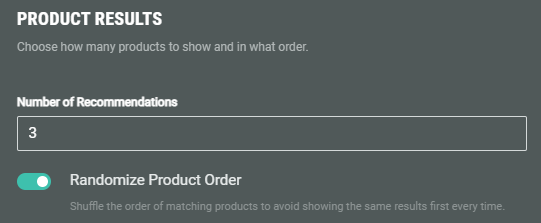 Randomize product order — When the toggle is enabled, it will randomize the order of product recommendations shown to the entrant to avoid showing the same results in the same order every time.