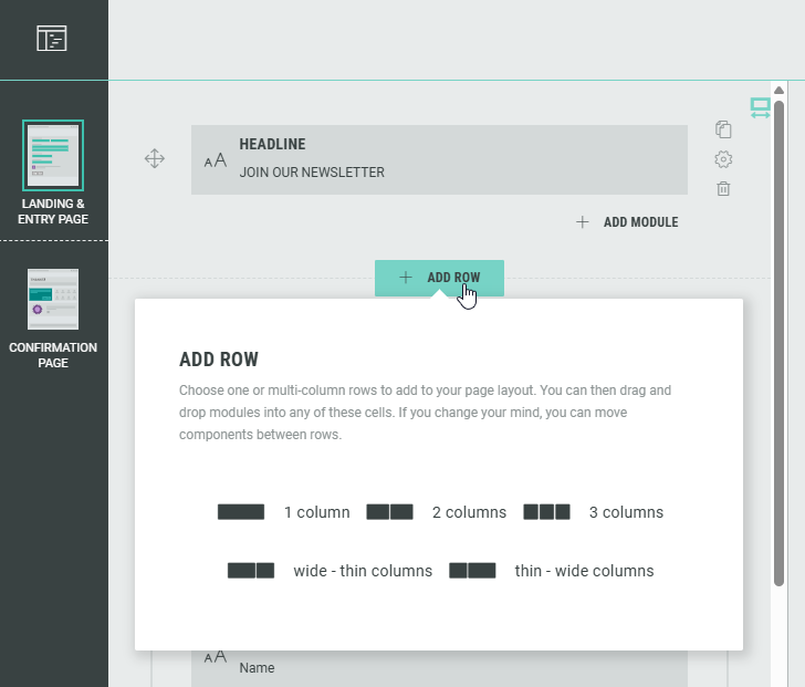 When building a page-based Experience, you can customize the layout of the pages by adding and editing Rows and/or Modules.