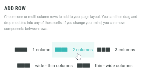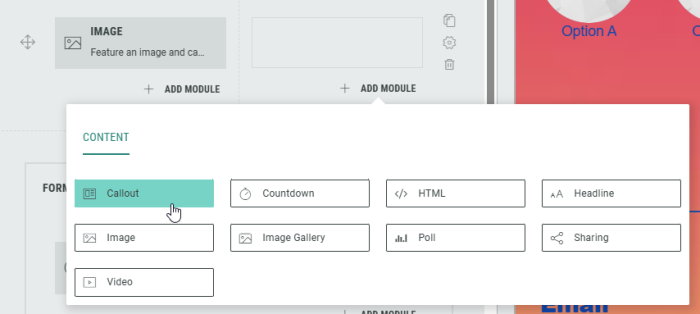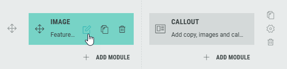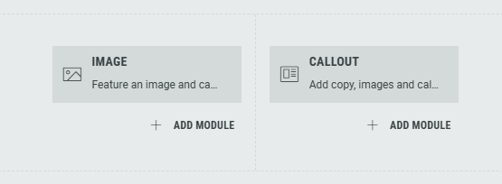 - Continuing from a 2-column row example, let's add an Image module in the left column and a Callout module in the right one.