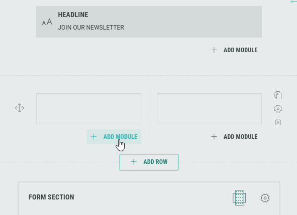 - To add a new module, click the + Add Module button that appears in each row (in each column for a multi-column row layout).