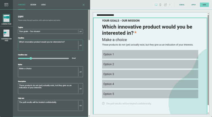 On the Logic tab, you can create different question paths for your audience to only ask questions that are relevant to them. This is based on conditional logic determined by answers given to previous polls in this Experience.