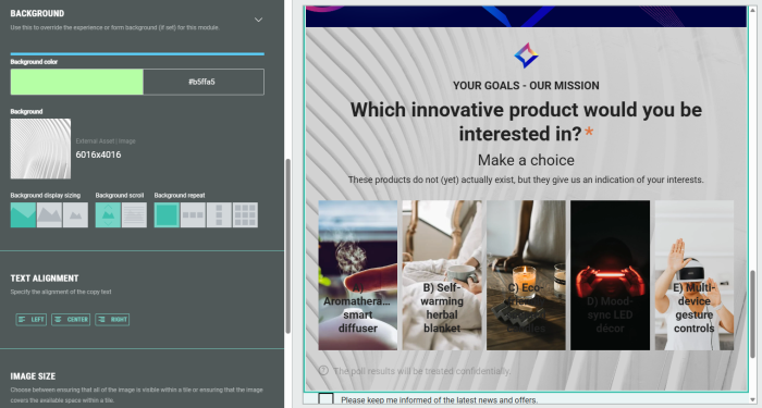 You can accompany the poll with images by selecting existing images or uploading new ones; this can be done for both the top (banner) image as for the icon image.