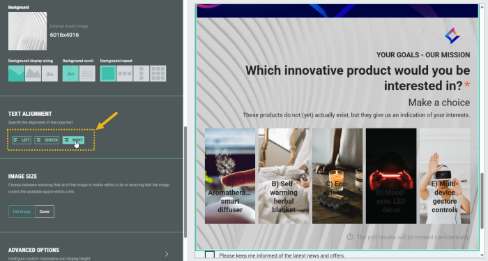 Specify the alignment of the text copy: Left, center or right aligned.