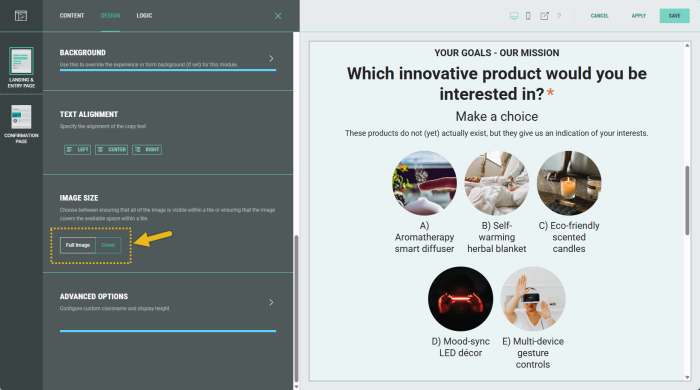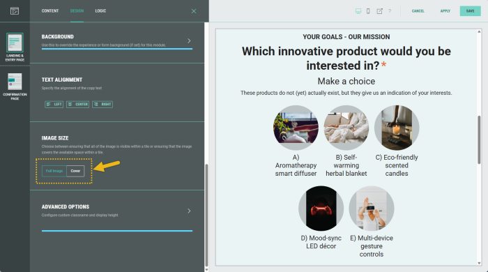 The following sections are available which can be edited (from the tabs at the top): Content, Design, Logic.