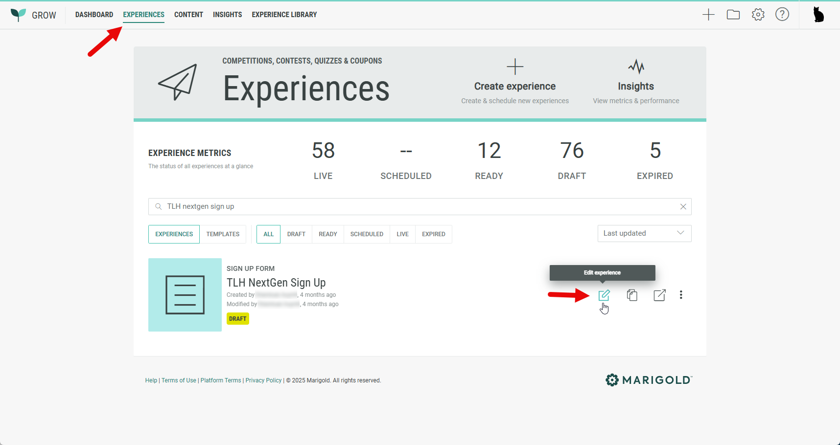 1. Find your Experience under the Experiences tab and edit the Experience by clicking on the Edit icon on the right hand side.