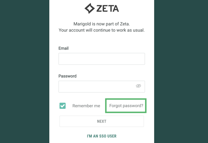 1. In the Welcome Email message, click Set Up. The Welcome to the Zeta Login pop-up window is displayed.