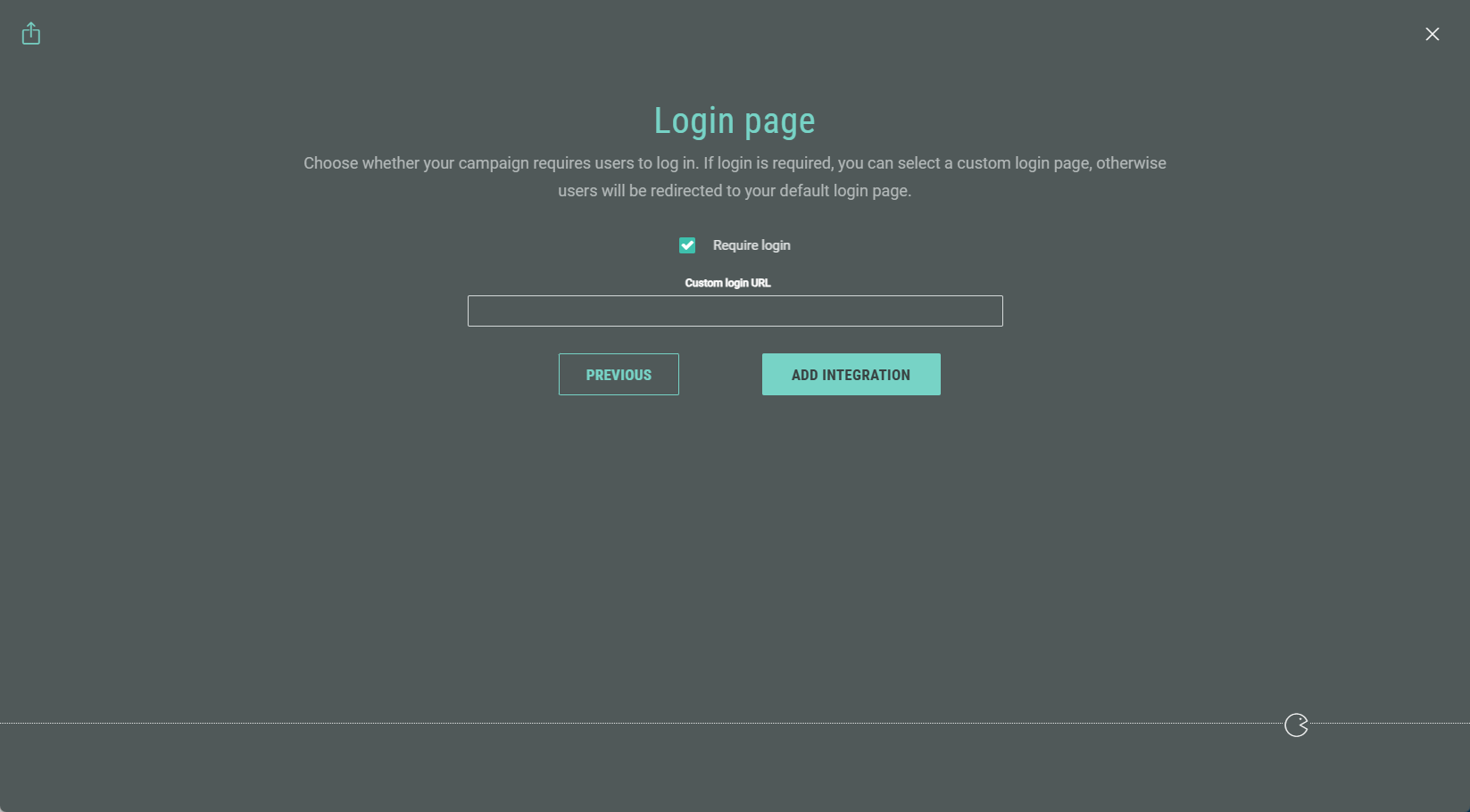 1. Choose whether your Experience requires participants to log in. If login is required, you can set a custom login URL. Otherwise users will be redirected to your default login page.