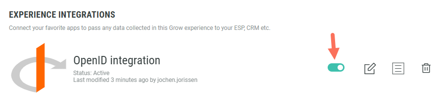1. You return to the Experience Integrations screen with the configured OpenID integration being visible. Click the toggle on the right to enable the integration.