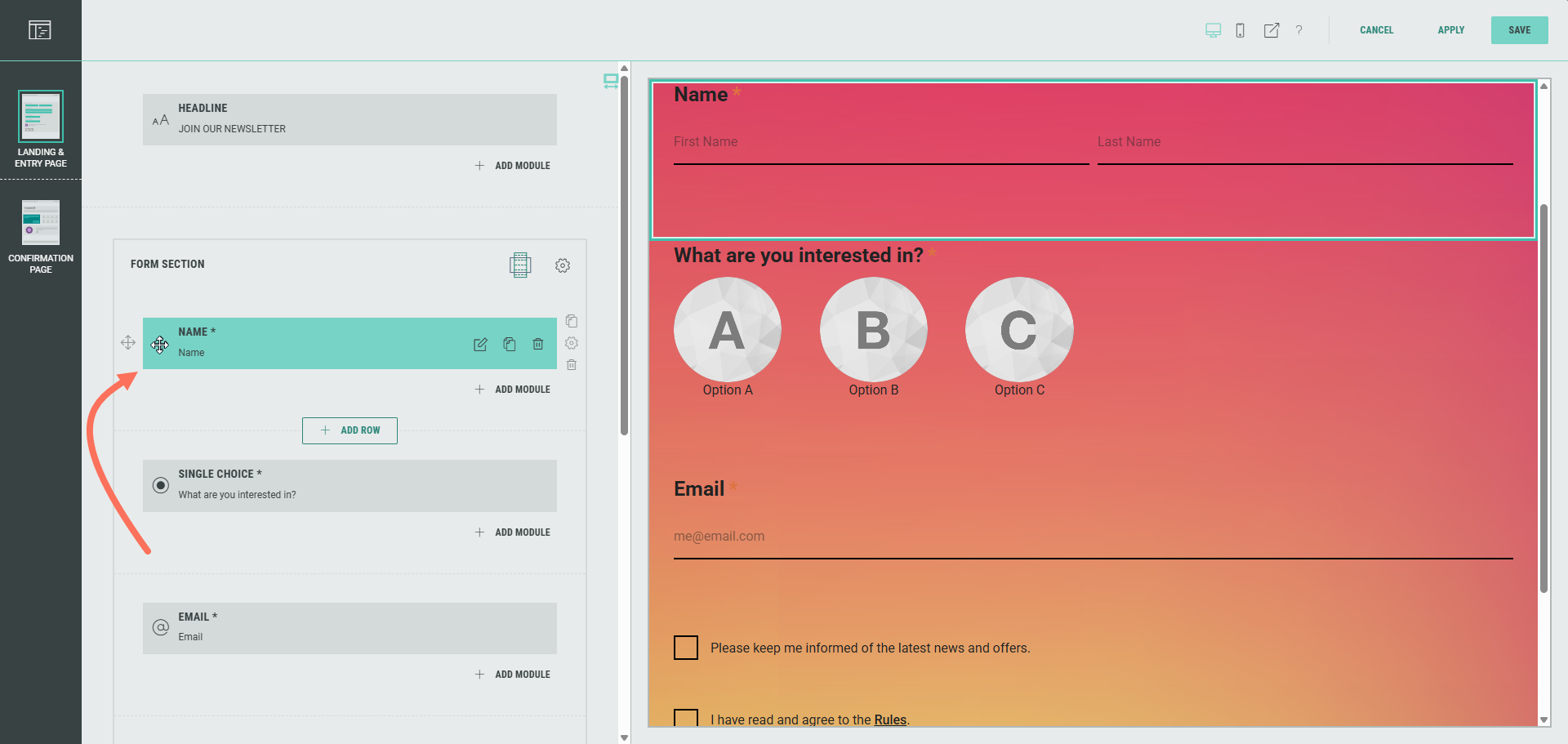 1. We want to personalize the label in the Single Choice module in the Form Section, so it shows the participant's first name once they're logged in through SSO (OpenID). To do so, first move the Name module so it's above the Single Choice module.